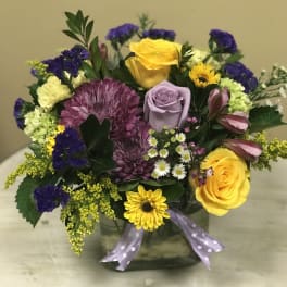 Price: $65.00 Custom Purple and Lavender Floral Arrangement Product Tags: Best seller Same-day Delivery